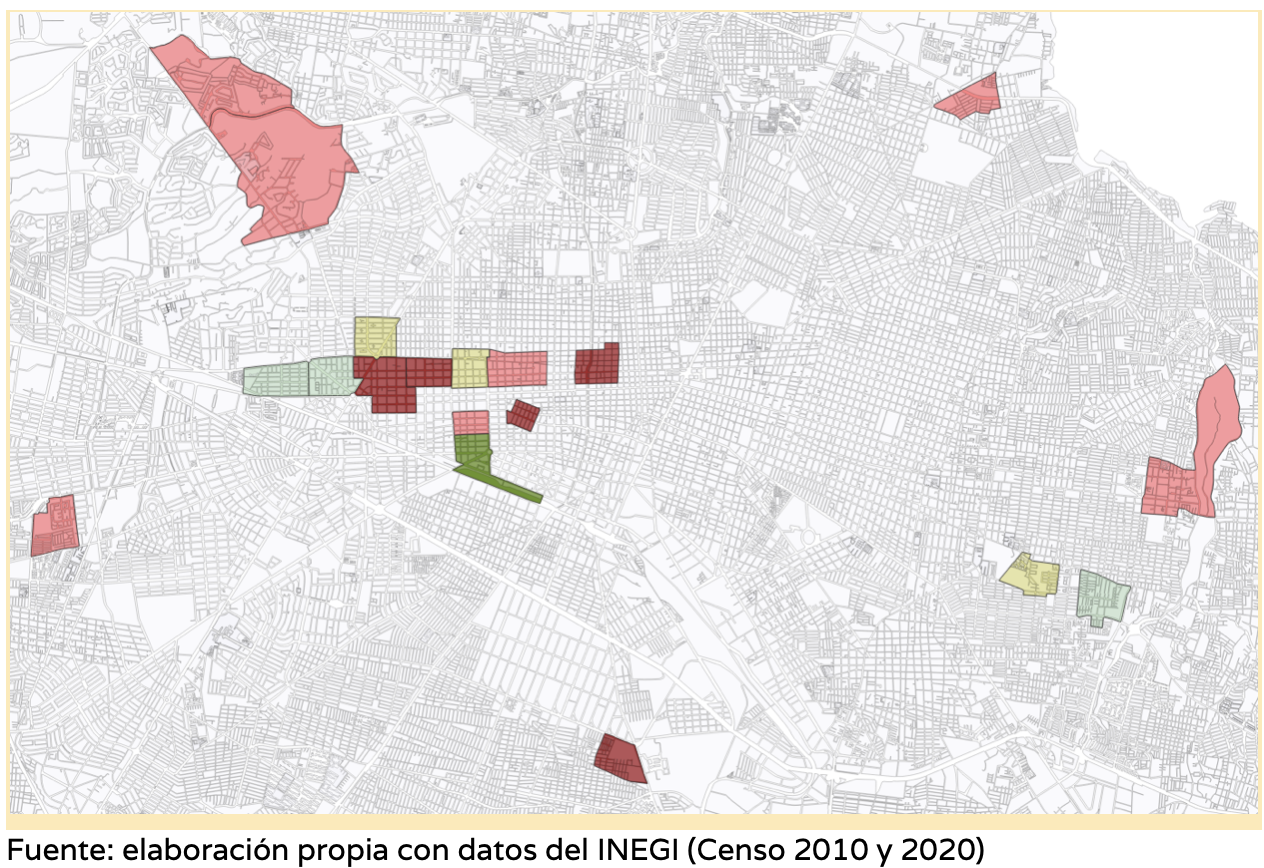 Los 56 desarrollos analizados se encuentran dentro de 26 áreas geoestadísticas básicas (AGEB), definidas por el INEGI como “un conjunto de manzanas que generalmente va de 1 a 50”.  En ellas, el equipo encontró que, comparando los datos del Censo de Población y Vivienda de 2010 y 2020, 16 AGEB mostraron una pérdida neta de 3 mil 997 personas.