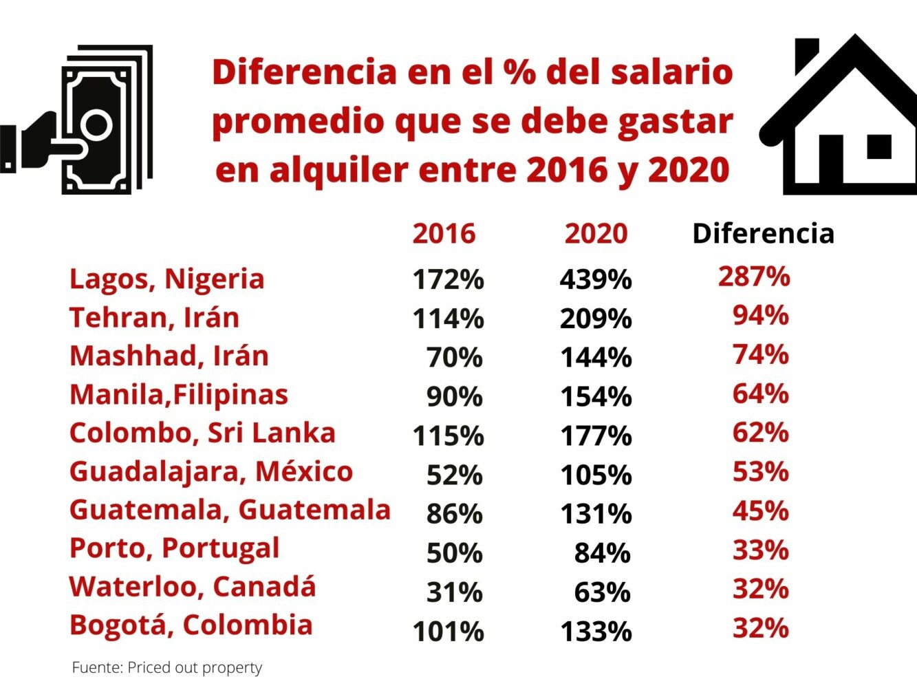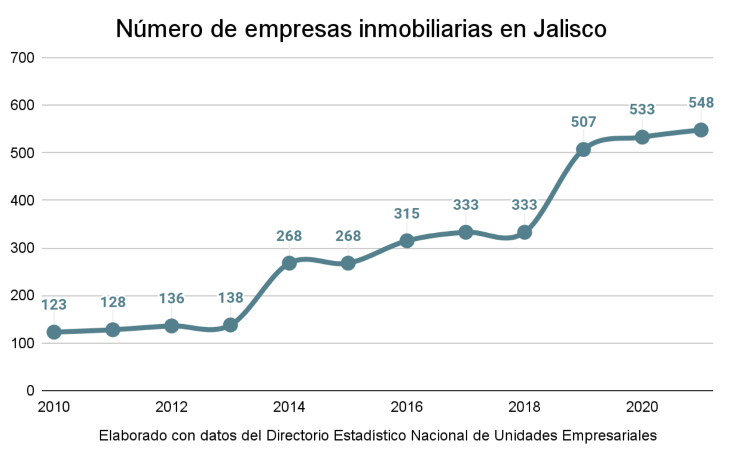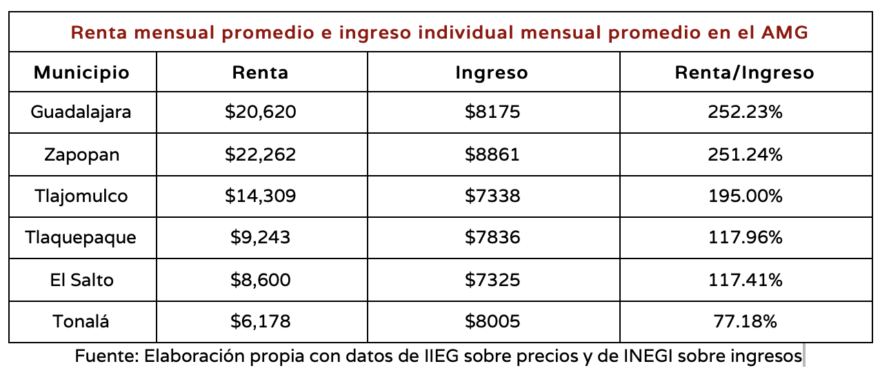 Según el estudio “Priced out Property” sobre las rentas en Guadalajara, en 2010 los precios promedio en el centro de la ciudad equivalían al 52% del salario promedio. En 2021 pasaron a representar el 102%.