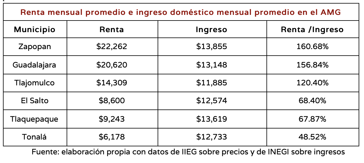 Bajo este criterio, la vivienda promedio en el AMG no es accesible. Incluso realizando esta comparación usando el ingreso promedio de los hogares en lugar del de las personas, la renta es demasiado alta en relación al ingreso.