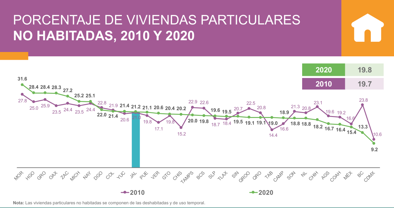 Es decir: la vivienda deshabitada o temporal crece a ritmos alarmantes en comparación con la vivienda habitada. En 2010, la ocupación de la vivienda (vivienda habitada dividida entre vivienda total) en la zona de estudio era de 84.89%, pero en 2020 cayó a 81.10%.