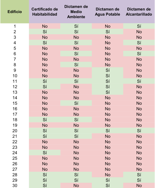 Con los datos otorgados fue posible identificar 2 mil 258 cuentas de predial distribuidas entre 22 edificios, todas ellas separadas individualmente por unidad habitacional. El edificio más pequeño tenía 20 cuentas y el más grande 335.