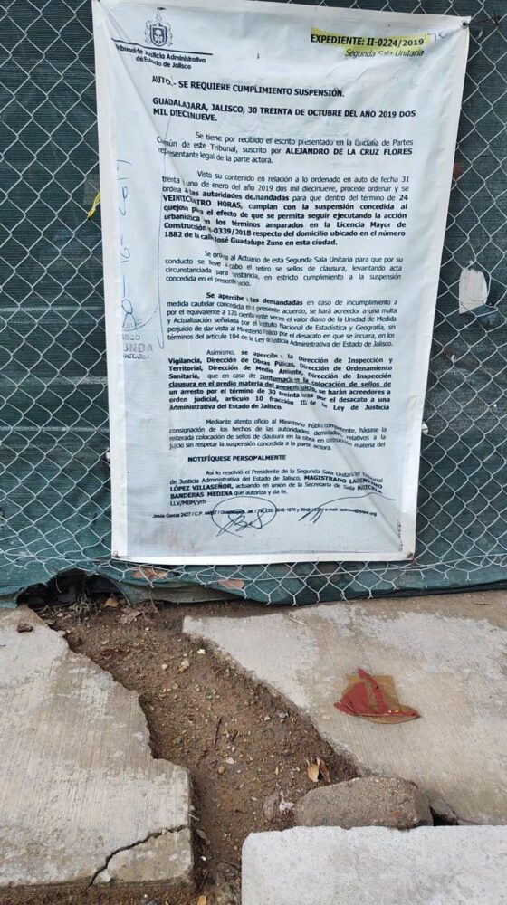 Protección Civil turnó un oficio a la Dirección de Obras Públicas de Guadalajara para que la construcción se clausurara por la lluvia de escombros: ─¿Sabes cuando vino Obras Públicas? Nunca duraron 2 años con material de construcción en la banqueta─.