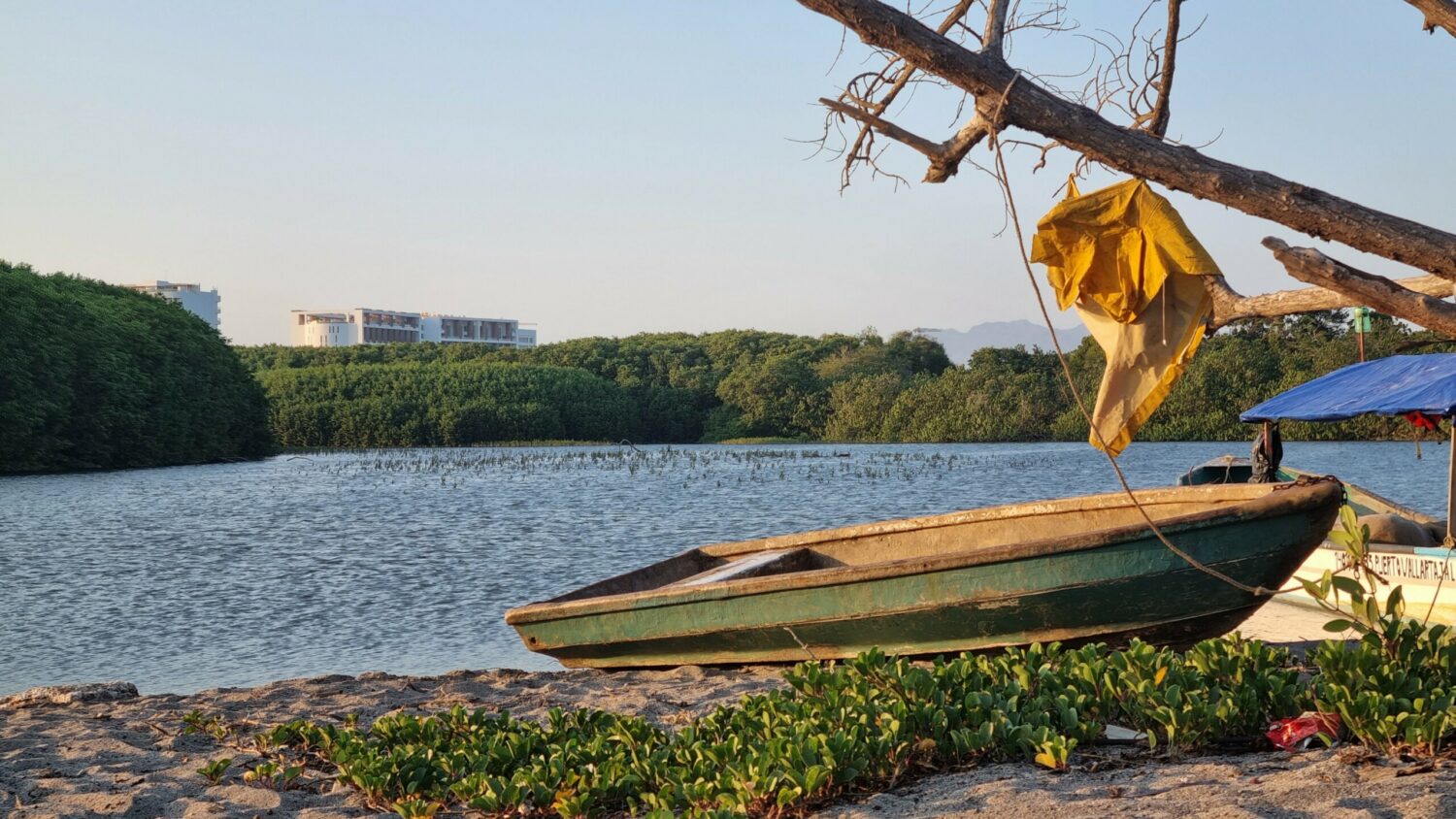 En la desembocadura del río yacen varias lanchas, algunas amarradas y otras encalladas. Grupos de pescadores van y vienen cargando redes y cañas de pescar. Desde ahí, del otro lado de los árboles de mangle ─vitales para el ecosistema por amortiguar el oleaje intenso de las tormentas, proveyendo también refugio y alimento para la fauna local─ se asoman dos enormes edificios blancos.