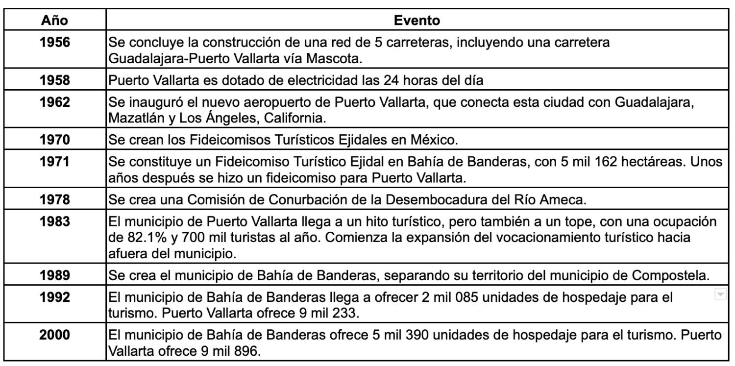 El avasallador desarrollo turístico y transformación de la región ha sido documentado por académicas notables como Huízar, aunque se suman otras como Erika Patricia Cárdenas o el estudioso Alfonso Baños. La siguiente tabla, dispuesta como línea de tiempo, se realizó con información producida por estas tres investigadoras locales.