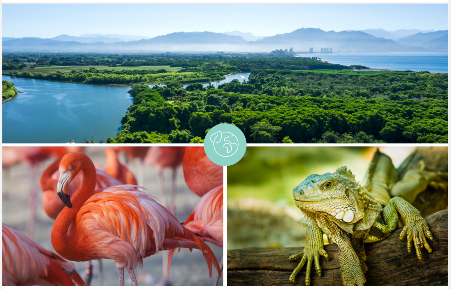 En la sección del folleto dedicada a esto aparece una fotografía tomada desde un balcón del hotel Grand Luxxe, donde se puede ver la playa de Boca de Tomates y la desembocadura del río Ameca. Ahí se muestran bellas imágenes del arbolado que aún queda ahí (acompañadas de una fotografía de un flamingo y otra de una iguana), en el único territorio que Vidanta no ha comprado y que tanto SEMARNAT como los ejidatarios no han cedido.