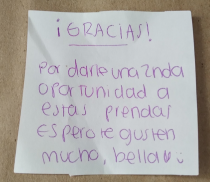 De esa manera comienza la conversación hasta que se acuerda la forma de pago y entrega del atuendo. Ofrece envíos a toda la república y pueden ser entregas personales en puntos establecidos en Querétaro o entregas por correos de México. Cuando llega el pedido, dentro del paquete Fernanda deja una notita en la que agradece tu compra.