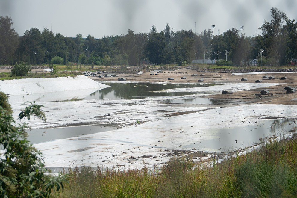 Un lago artificial que estaba a 10 minutos de la puerta seis de la Ciudad Deportiva, ahora está casi seco y cubierto por lonas blancas intentando cubrir su abandono.