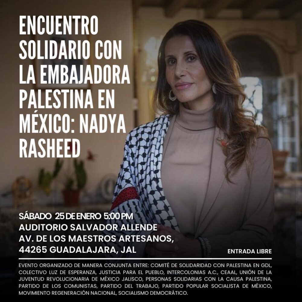 Las acciones y movimientos solidarios por la paz en Palestina se han expresado en todas las regiones del mundo. También en nuestra ciudad se ha convocado en diversos momentos a manifestarse y repudiar la violencia contra la población civil de Gaza. Una diversidad de colectivos y redes invitó a la Excma. Sra. Nadya Rasheed, embajadora del Estado de Palestina en México, para conocer de viva voz la lucha por la libertad y el derecho a vivir en paz de su pueblo.