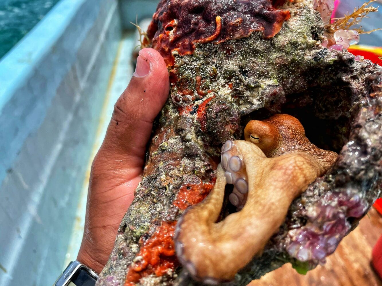 “A las botellas de cloro les hacen un pequeño hueco y cuando identifican alguna cueva de pulpo, lo echan y ya sale solo. Pero hemos notado que esto daña los arrecifes, los corales mueren y otras especies que están ahí”, menciona.