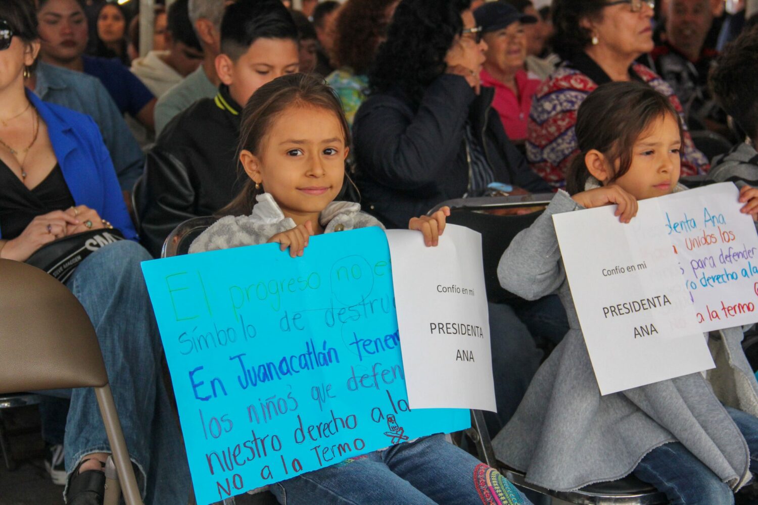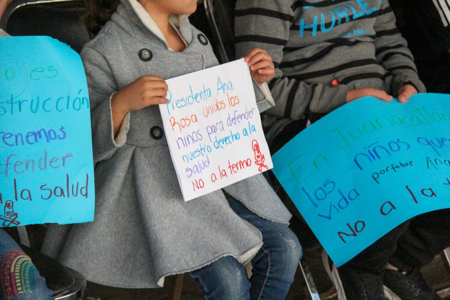Niñas y niños se sumaron a la manifestación con carteles demandando a las autoridades que no permitan la termoeléctrica. Mateo, un niño de Juanacatlán, fue quien cuestionó a las autoridades su posicionamiento, “¿De qué lado están? ¿De los ricos empresarios que solo les importa generar dinero sin importar el costo? ¿O del pueblo que los eligió y confió en ustedes? Es por eso que hoy les pedimos su respaldo, no al cambio de uso de suelo”.